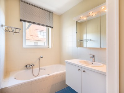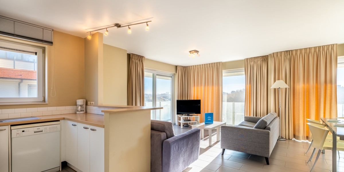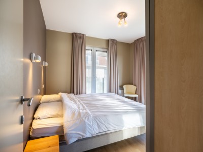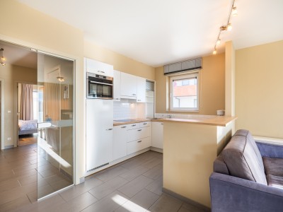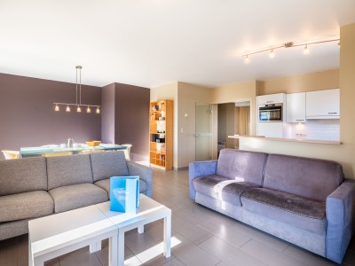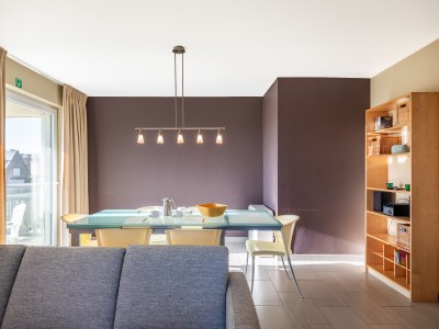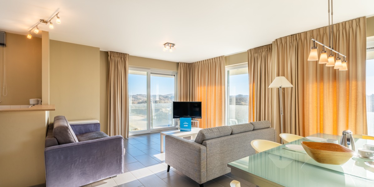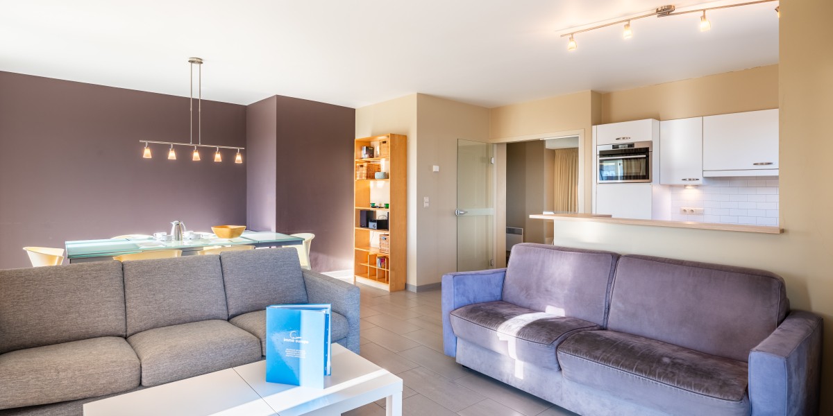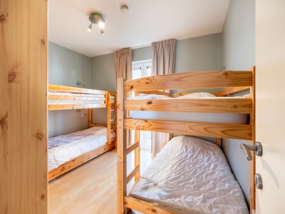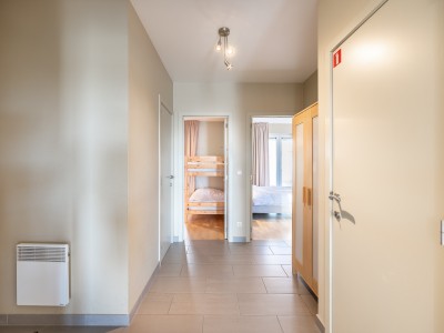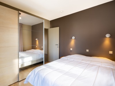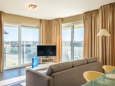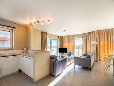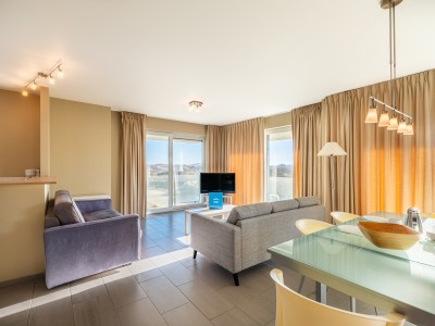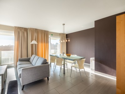 Geräumiges und sonniges Wohnzimmer, modernes Interieur , zwei Schlafzimmer, eines mit Doppelbett und eines mit 2 Etagenbetten. Diese Wohnung hat 2 Badezimmer: eines mit Dusche und eines mit Badewanne. Balkon mit dunenblick und garage ins gebaude.