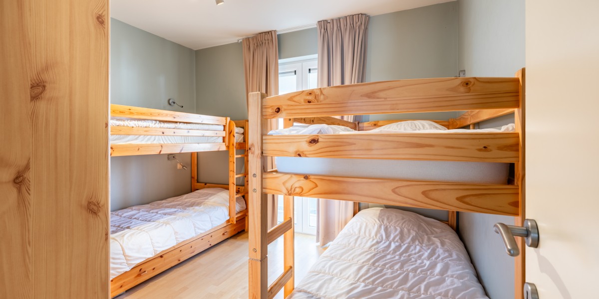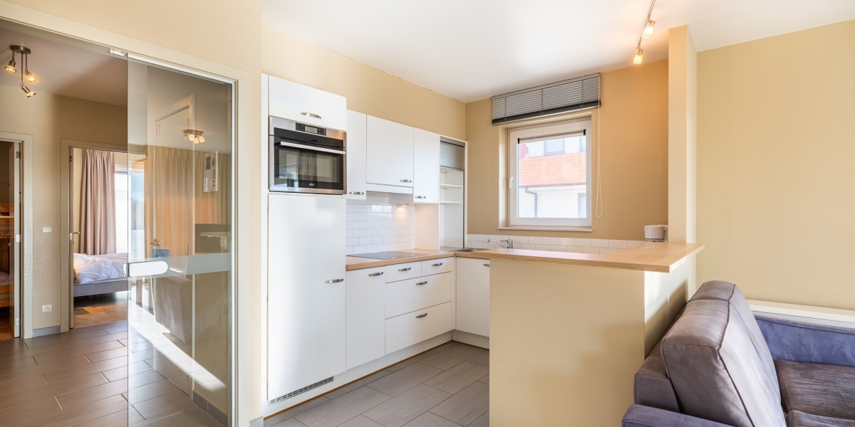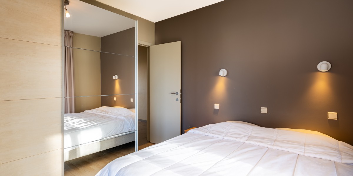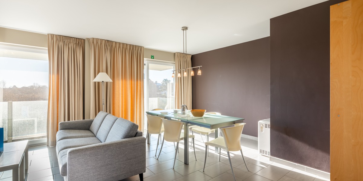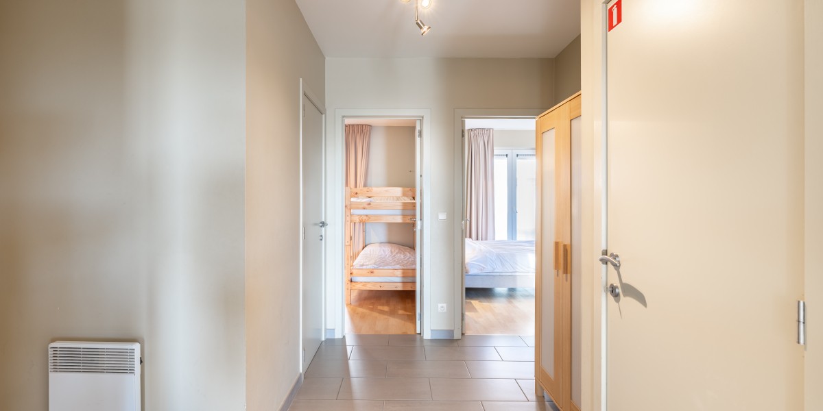 Geräumiges und sonniges Wohnzimmer, modernes Interieur , zwei Schlafzimmer, eines mit Doppelbett und eines mit 2 Etagenbetten. Diese Wohnung hat 2 Badezimmer: eines mit Dusche und eines mit Badewanne. Balkon mit dunenblick und garage ins gebaude.