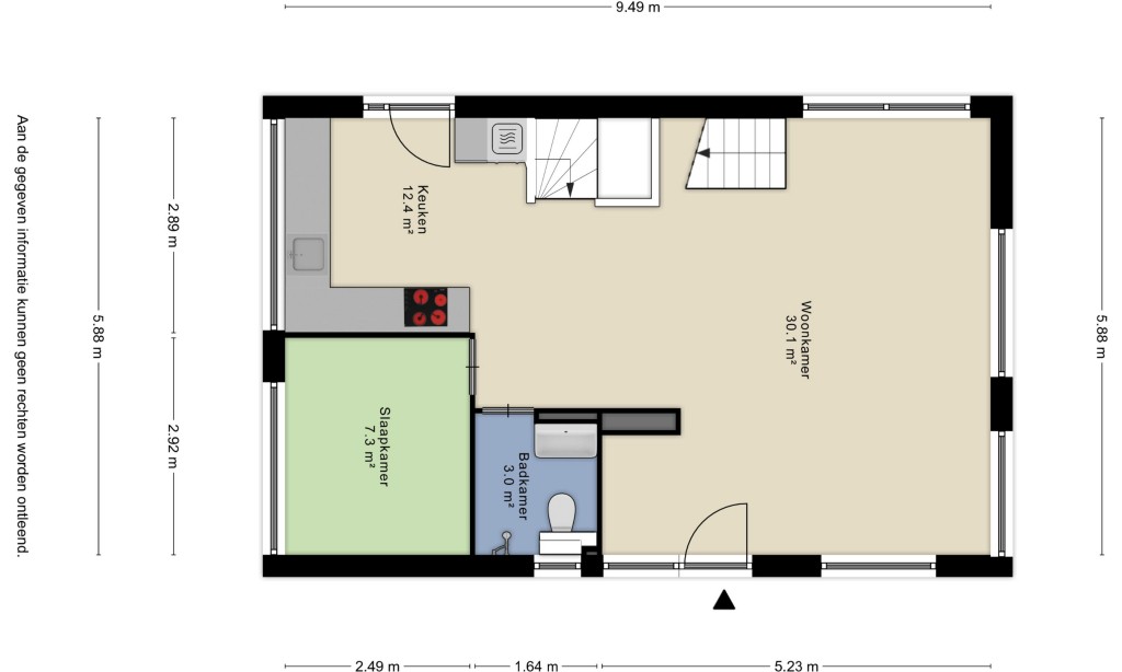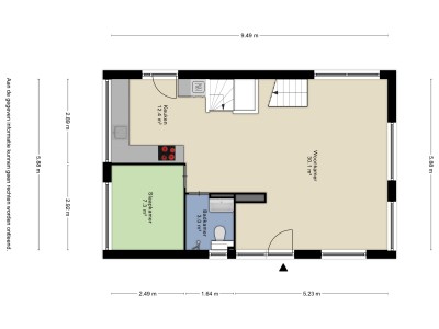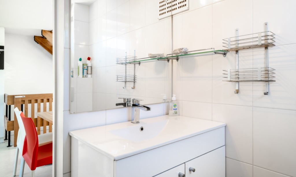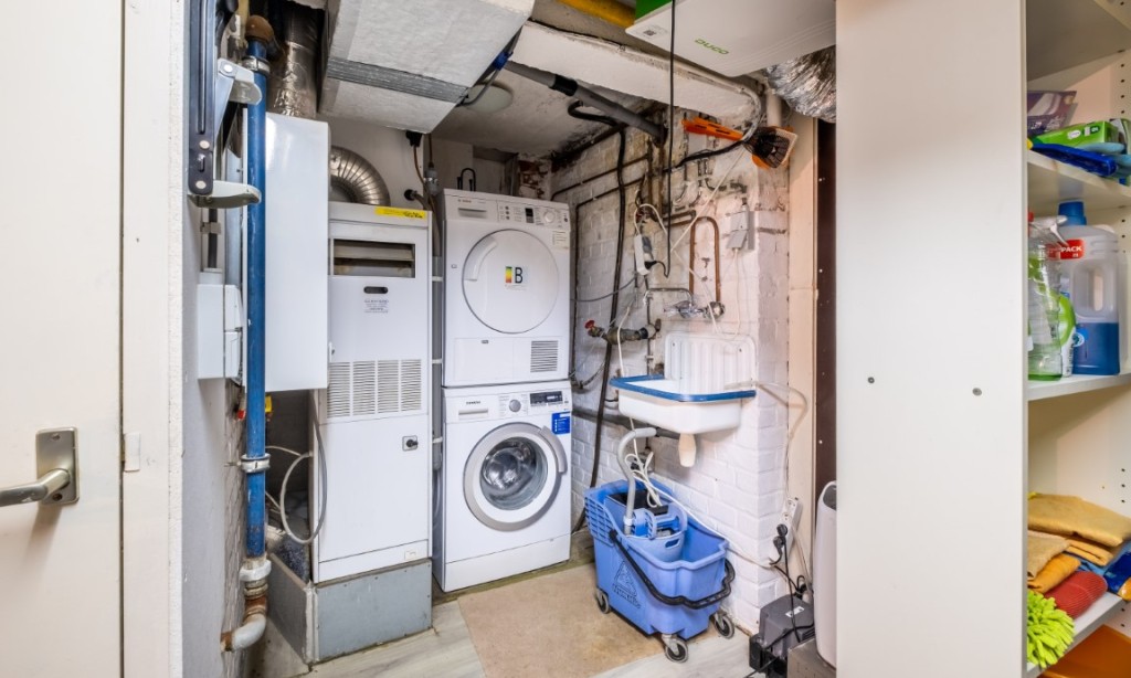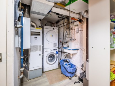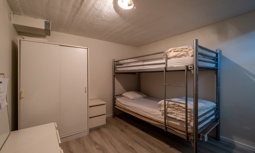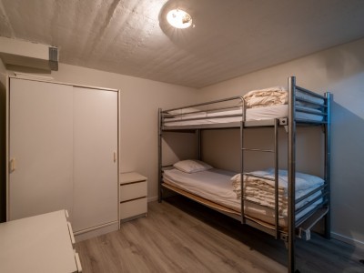 Ein fensterloses Schlafzimmer mit einem Etagenbett. Durch diesen Raum haben Sie Zugang zum Abstellraum mit Kühlschrank mit Gefrierfach (3 Schubladen), Waschmaschine, Trockner und anderen Reinigungsgeräten.