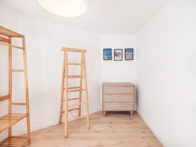 Offene Einbauküche, Wohn-/Esszimmer, Zugang zum kleinen Garten, 1 Schlafzimmer mit Doppelbett, 1 Badezimmer mit begehbarer Dusche, 1 Toilette, Abstellraum mit Waschmaschine.