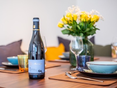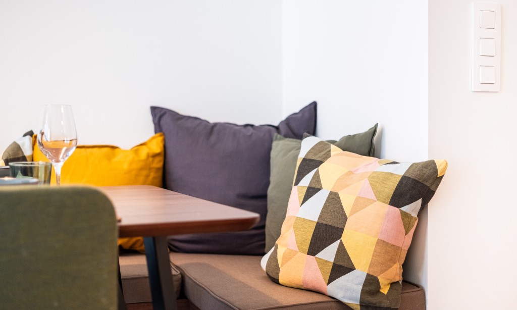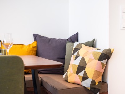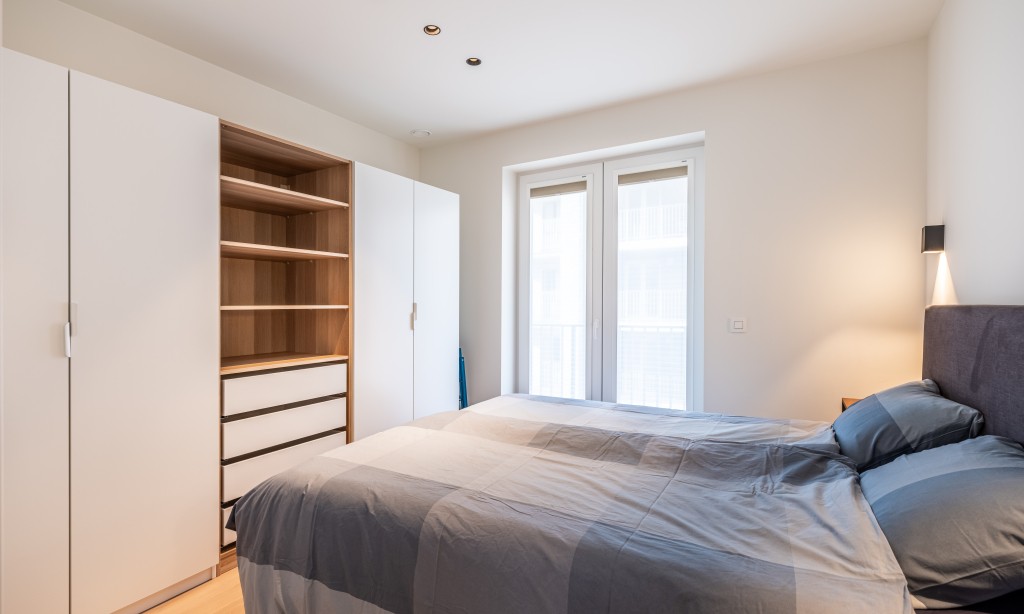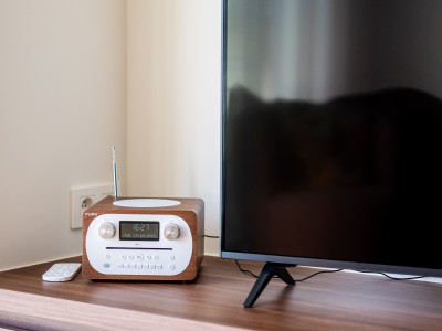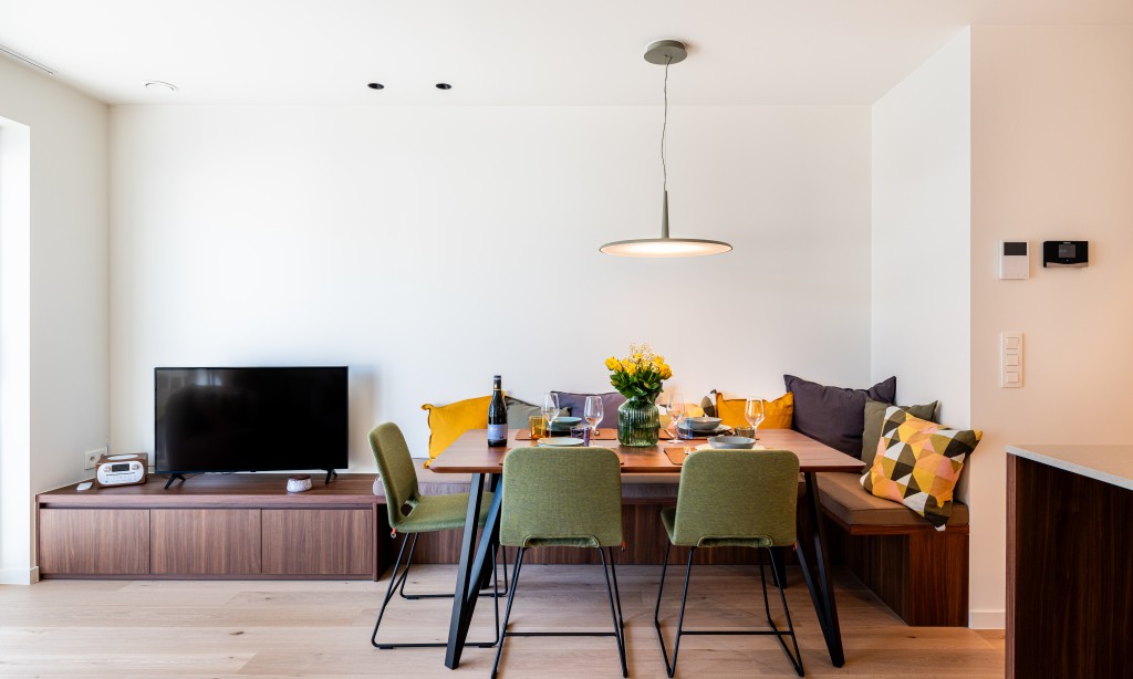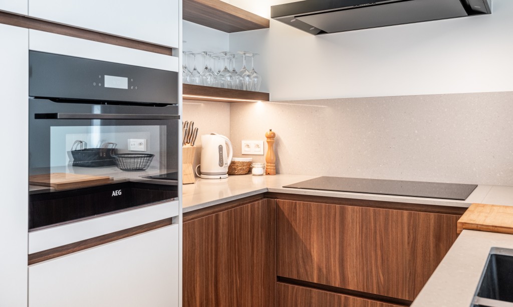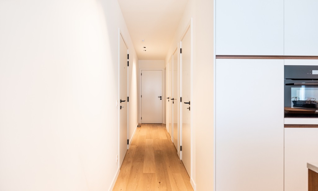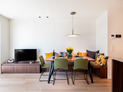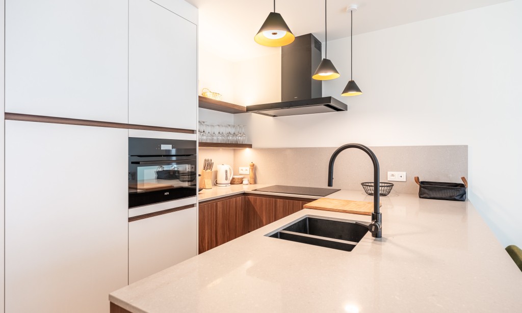 Die Wohnung besteht aus einem sonnigen Wohnzimmer mit integrierter, stilvoller und moderner Einbauküche mit Geschirrspüler, Kombi-Backofen, großem Kühlschrank, Induktionskochfeld. Außerdem ein Esstisch für 6 Personen mit gemütlichem Sofa und 2 zusätzlichen Barhockern am Küchentisch. Es gibt einen praktischen Abstellraum, ein Badezimmer mit begehbarer Dusche und Waschbecken, eine separate Toilette, ein Schlafzimmer mit einem Doppel-Boxspringbett, ein Schlafzimmer mit 2 Einzel-Boxspringbetten. Insgesamt können 4 Personen übernachten. Sonniger Balkon an der Vorderseite mit 2 Liegestühlen und einem Tisch, auch ein Balkon an den Schlafzimmern.
