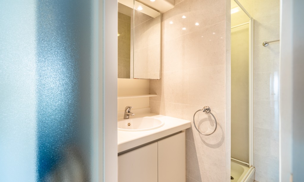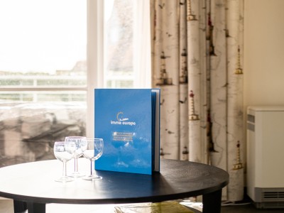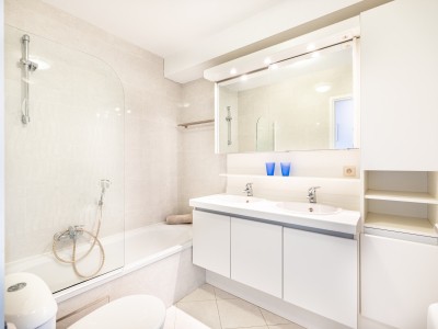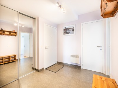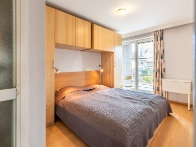 Die Wohnung umfasst einen Eingangsbereich mit separater Toilette, Garderobe, Wohnzimmer mit Balkon/Terrasse rundum, offene und ausgestattete Küche mit Glaskeramikkochfeld, Geschirrspüler, kombiniertem Mikrowellenherd, Kühlschrank mit Gefrierfach. Ein Abstellraum mit Waschmaschine, Trockner, Bügeleisen, Bügelbrett und Wäscheständer. Essbereich mit Tisch und 8 Stühlen, 2 Stühlen + Hocker (Modell Ikea Pello), Schlafsofa für 2 Personen im Wohnzimmer, 1 Schlafzimmer mit 1 Doppelbett und eigenem angrenzenden Bad mit Dusche, 2. Schlafzimmer mit Etagenbett und ausziehbarem Lattenrost + Matratze für eine Person, 3. Schlafzimmer mit 2 Einzelbetten nebeneinander, 2. Bad mit Badewanne, Toilette und Waschbecken.