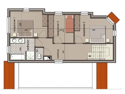 Im 1. Stock: Treppenabsatz mit separater Toilette, Badezimmer mit Waschbecken, Badewanne und Dusche, 1 Schlafzimmer mit Etagenbett und Ausziehbett (3 Einzelbetten),