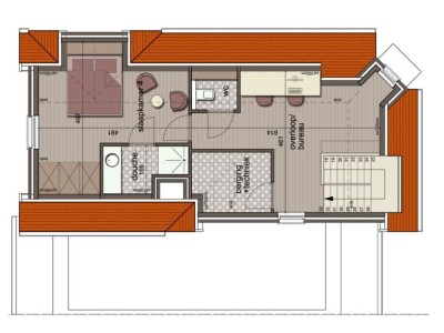 2.Stock: Die Nachthalle mit separater Toilette, großer Bürobereich mit WLAN und Ethernet-Anschluss (UTP) für Studenten oder Personen, die im Homeoffice arbeiten, 1 Schlafzimmer mit Doppelbett und Doppelbettdecke. Dieses Zimmer hat ein eigenes Badezimmer mit Waschbecken und Dusche.