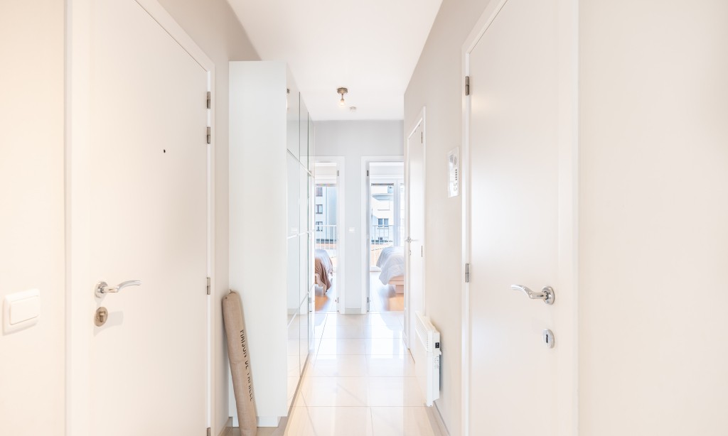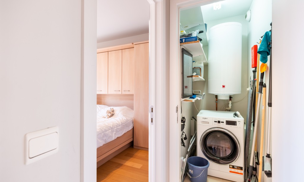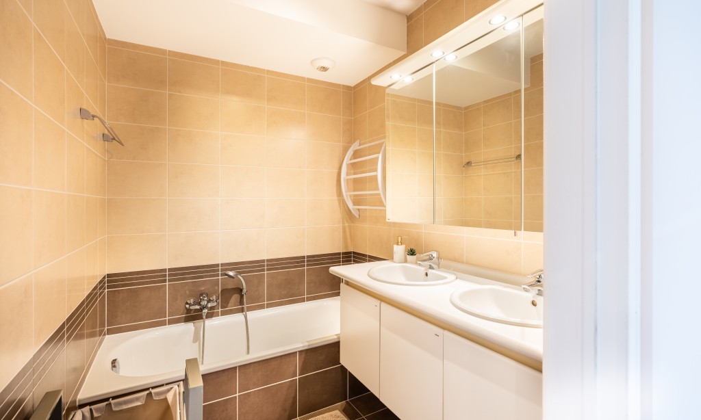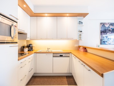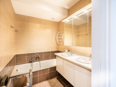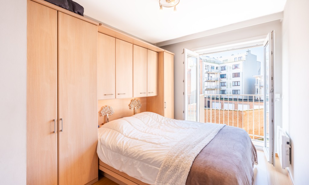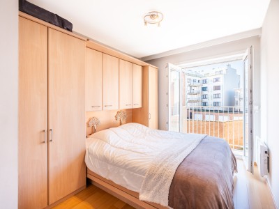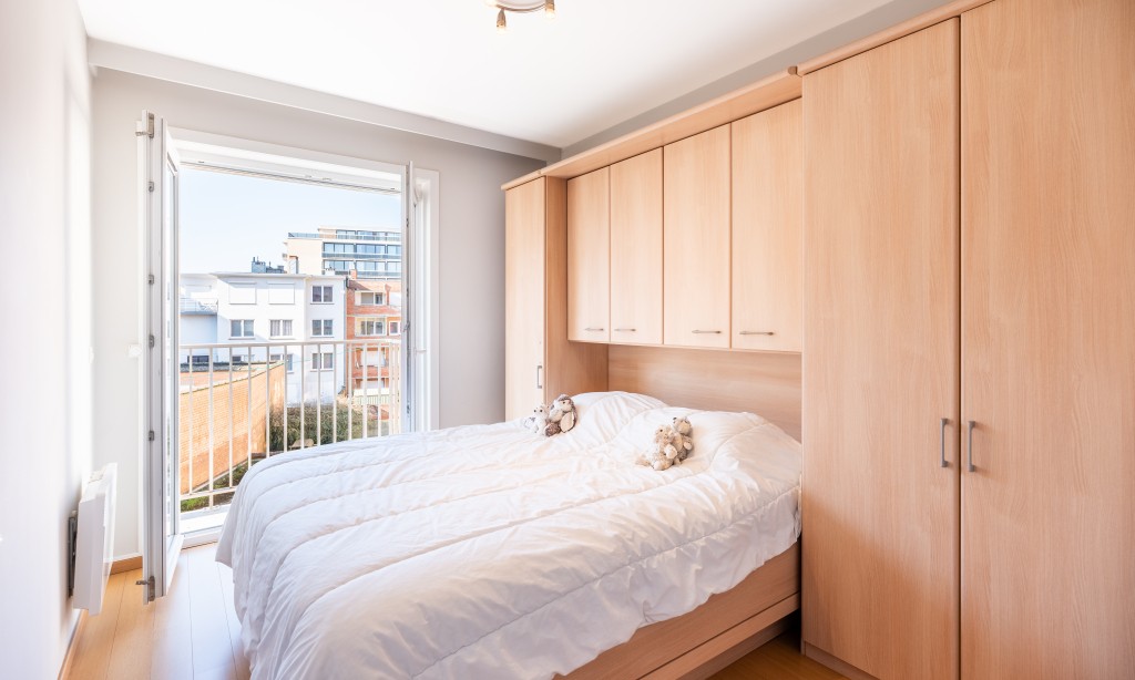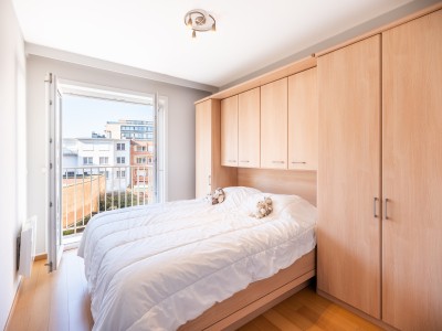 Zwei Schlafzimmer mit Doppelbetten (160 cm), große Kleiderschränke und ein sonniger Balkon auf der Rückseite des Gebäudes. Eines der Schlafzimmer verfügt zudem über eine Dusche und ein Waschbecken. Ein Reisebabybett ist vorhanden.
