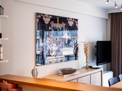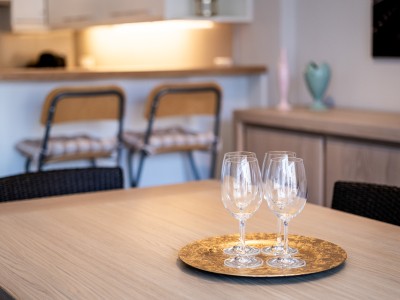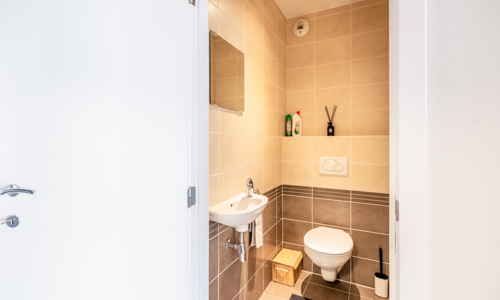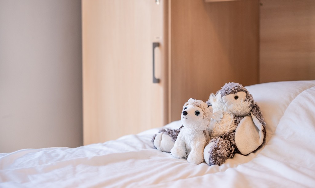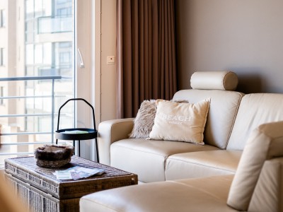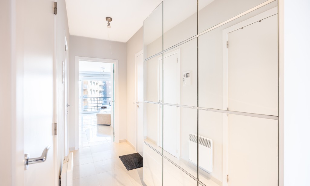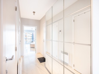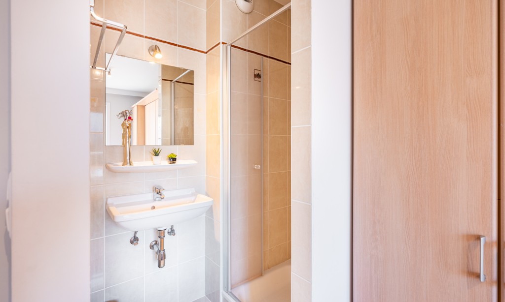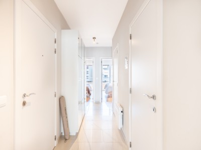 Zwei Schlafzimmer mit Doppelbetten (160 cm), große Kleiderschränke und ein sonniger Balkon auf der Rückseite des Gebäudes. Eines der Schlafzimmer verfügt zudem über eine Dusche und ein Waschbecken. Ein Reisebabybett ist vorhanden.