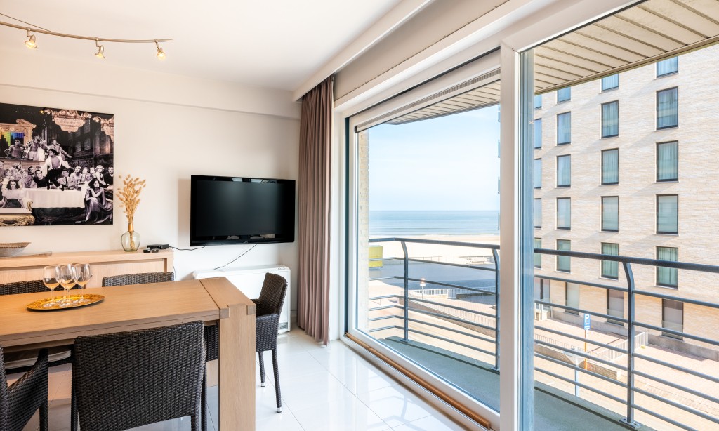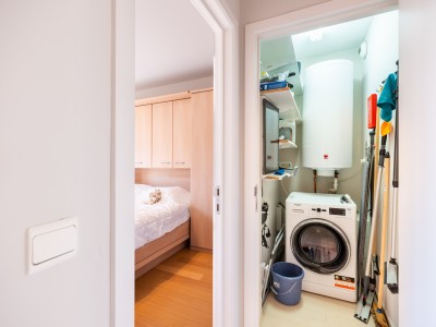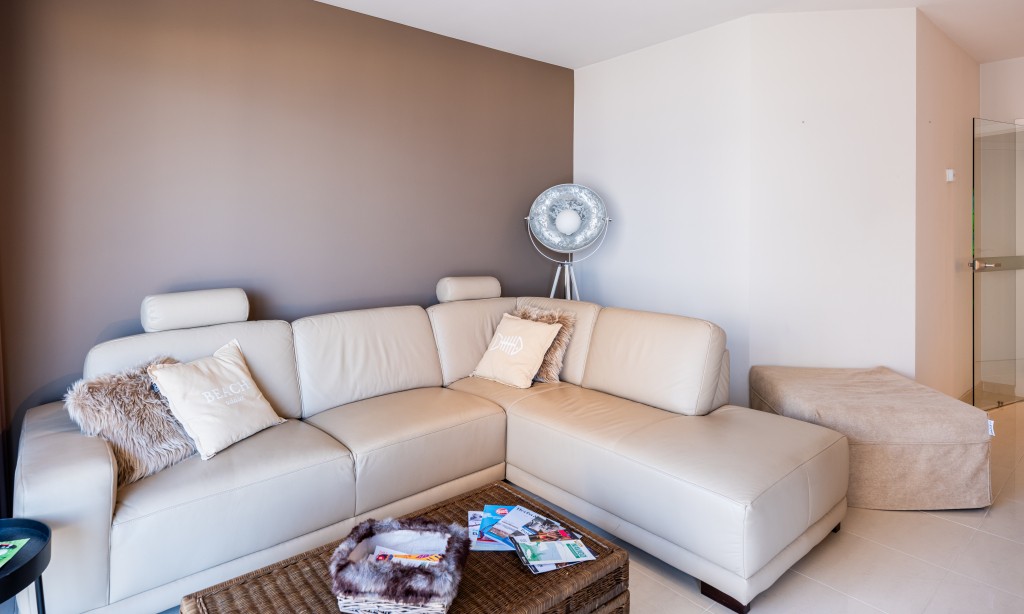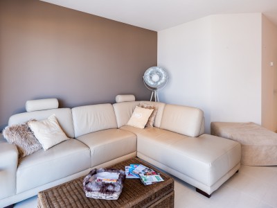 Eingangshalle mit Garderobe, Abstellraum mit Waschmaschine, separates WC, Wohnzimmer mit Esstisch und 6 Stühlen, bequeme Eckcouch und Klappbett für 1 Person. Zugang zum Balkon mit Meerblick.