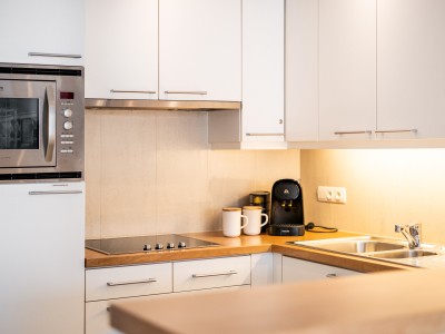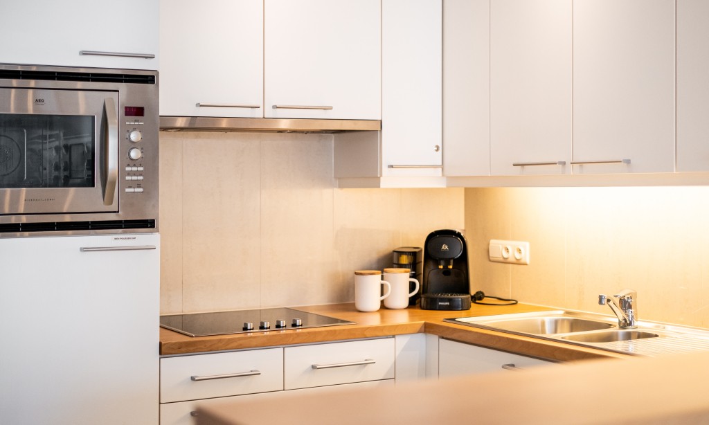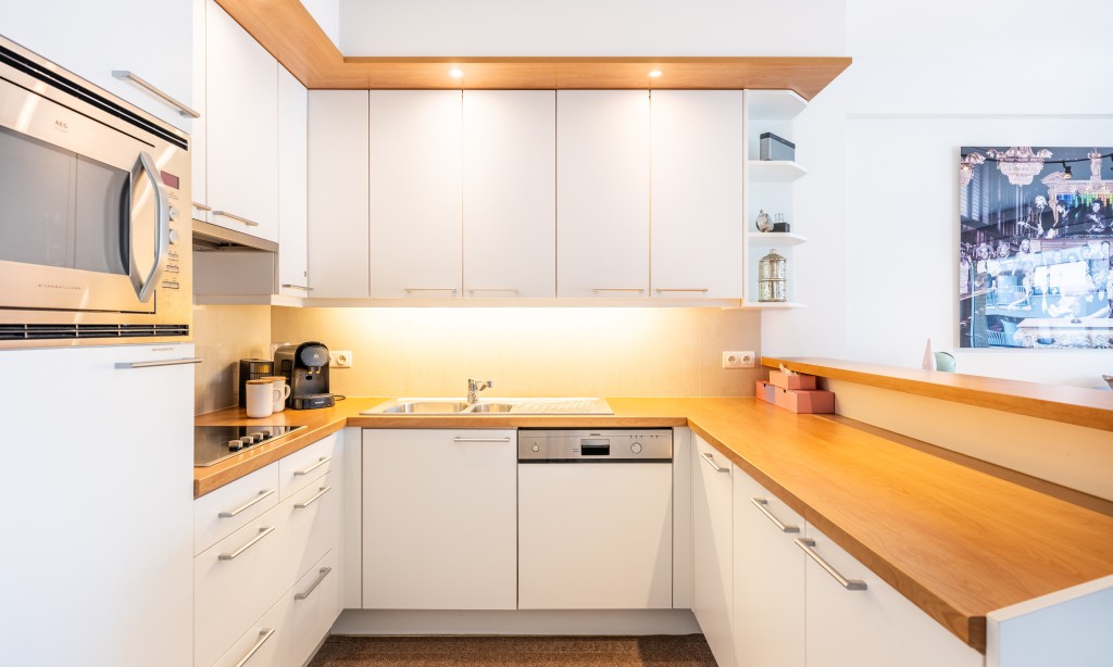 Die Küche ist ausgestattet mit einem Kühlschrank, einer Kombi-Mikrowelle und einer Spülmaschine. Badezimmer mit Waschbecken und Badewanne.