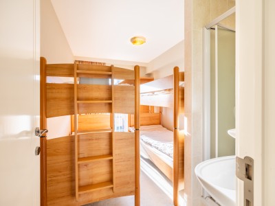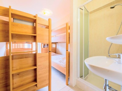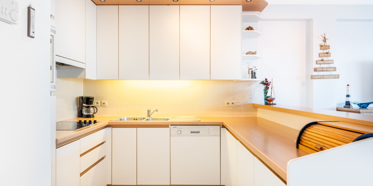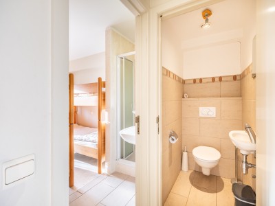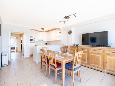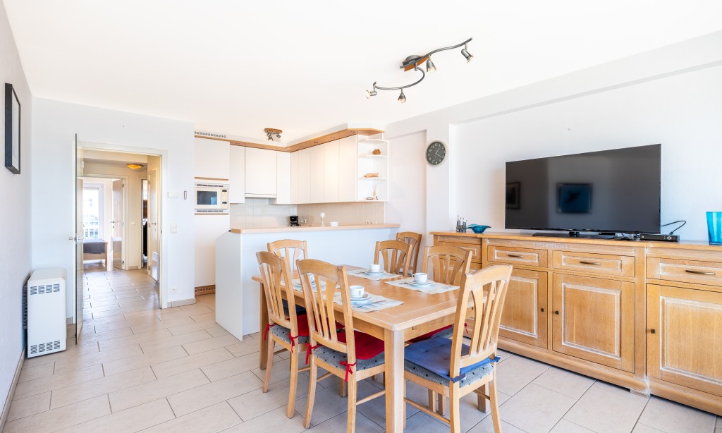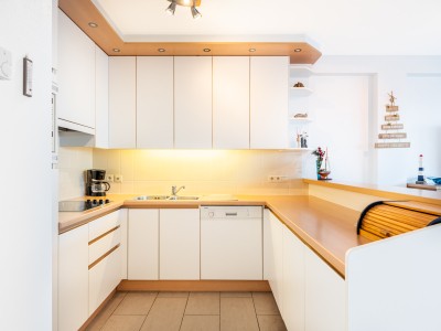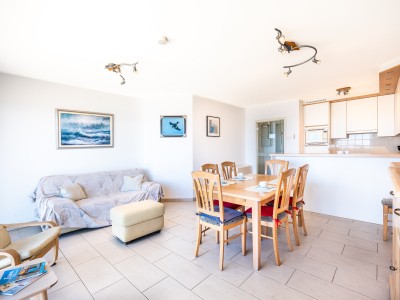 Modern eingerichtetes Wohnzimmer mit balkon und schönes Meerblick, offene völlig asgestattete Küche. Schlafzimmer mit Doppelbett und eigenem Dusche. Schlafzimmer mit 2 Etagenbetten. Badezimmer mit Badewanne. Separate Toilette.