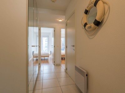 Halle, Wohnzimmer mit offene ausgestattete Küche, Wohnzimmer mit Meerblick und Balkon, Schlafsofa im Wohnzimmer, Badezimmer mit Dusche, separates WC, ein Schlafzimmer mit 2 Betten und 1 Schlafzimmer mit 2 Einzelnbetten.