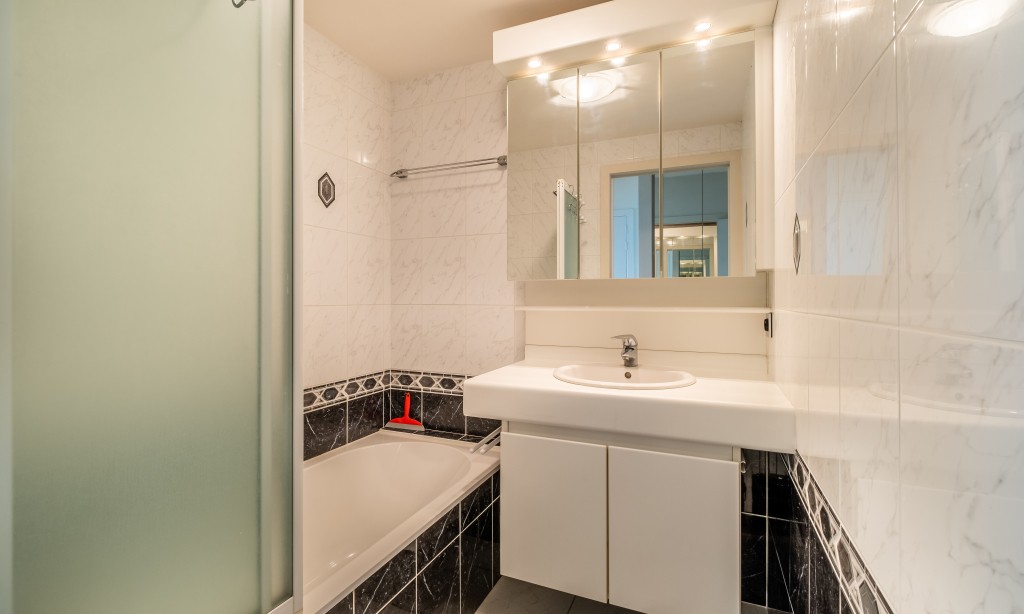 Wohnzimmer mit Meerblick. Einbauküche mit Glaskeramikplatte, Tepan-Platte, Backofen und Kombi-Mikrowelle, Kühlschrank mit Gefrierfach, Geschirrspüler. Badewanne mit Duschwand. Getrennte Toilette. Schlafzimmer mit Doppelbett und Schlafzimmer mit Doppelbettcouch.
