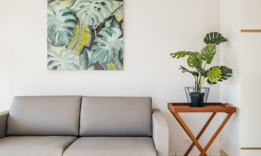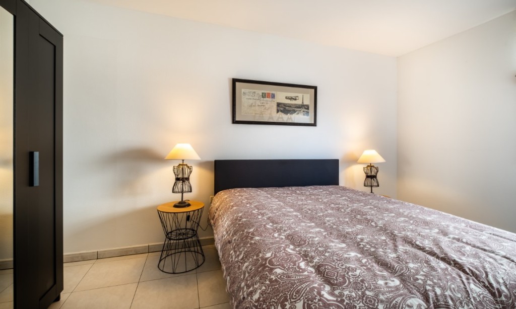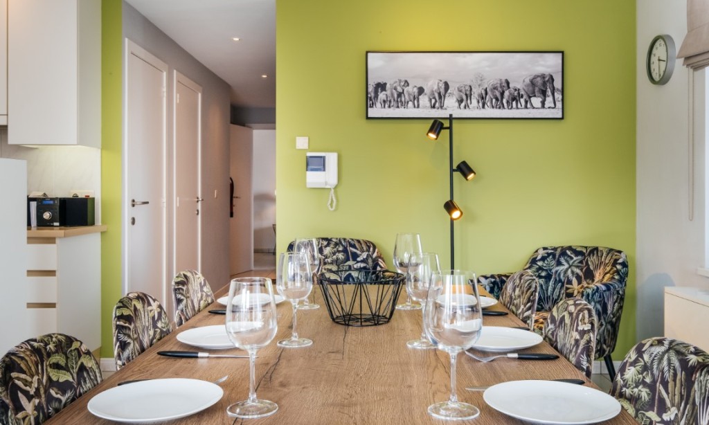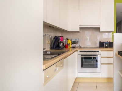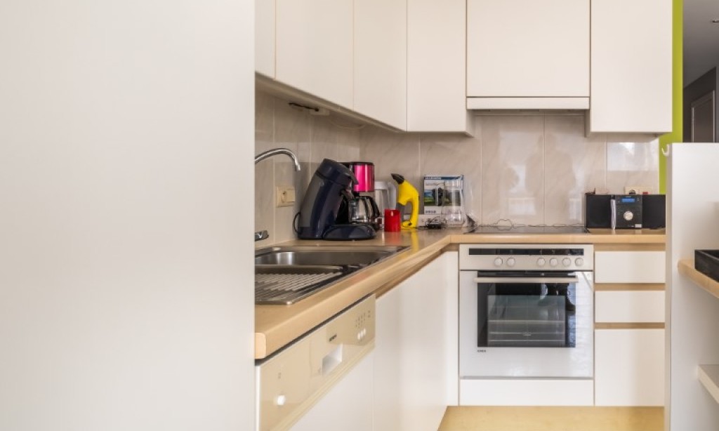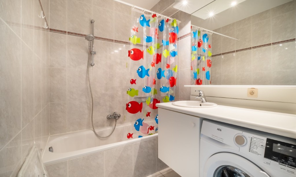 Sonniges Wohnzimmer mit Balkon und modernen Möbeln, offene Küche, 2 Schlafzimmer, 1 Zimmer mit Doppelbett, 1 Zimmer mit Etagenbett (Doppelbett unten und 1 Pers. oben), Badezimmer mit Badewanne und Duschvorhang und Waschmaschine, separates WC.