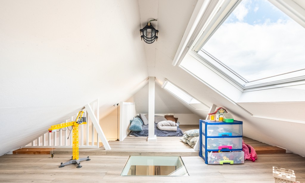 Ein Spielboden mit Sitzsäcken, eine Leseecke und ein großes Sortiment an Playmobile und Lego. Aufstehen auf dem Dachboden ist in der Mitte möglich, nicht an den Seiten