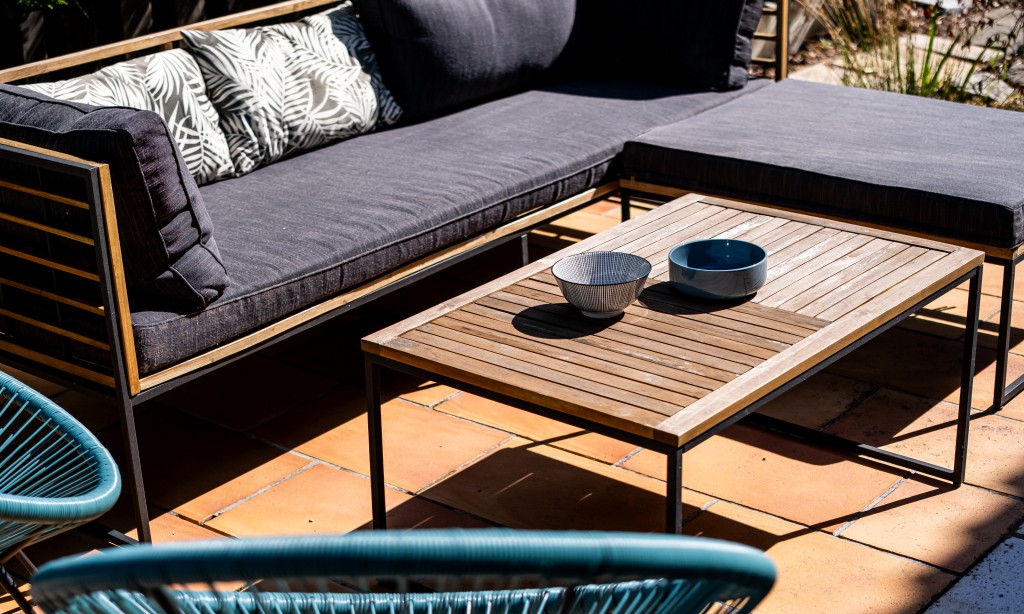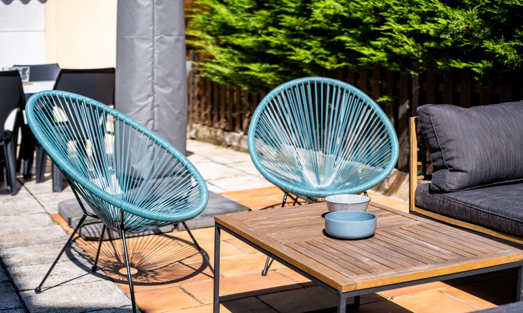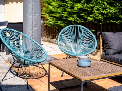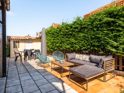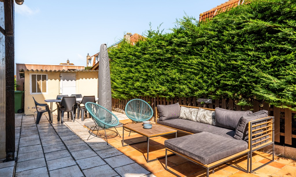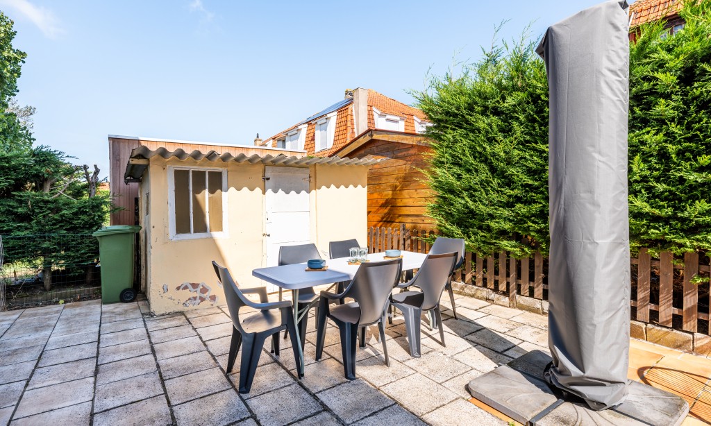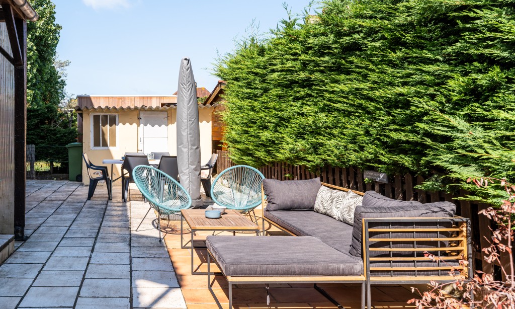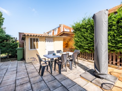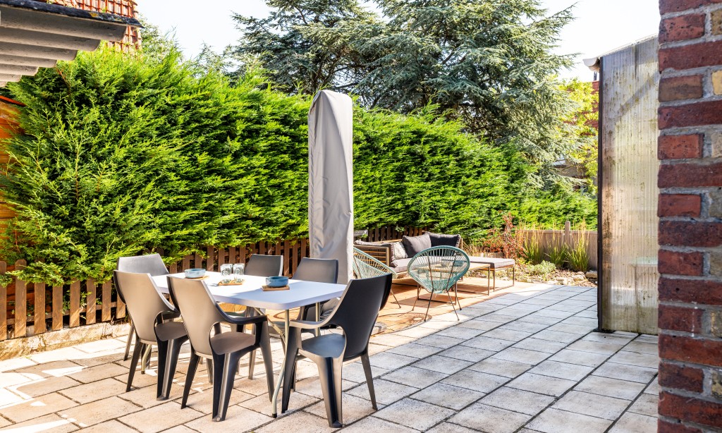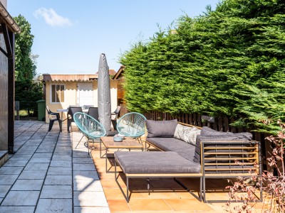 Einfahrt mit Platz für 1 Auto, möblierte Terrasse an der Seite des Hauses mit Grill, Lounge-Set für 6 Personen, Tisch, 6 Stühle und großer Sonnenschirm.