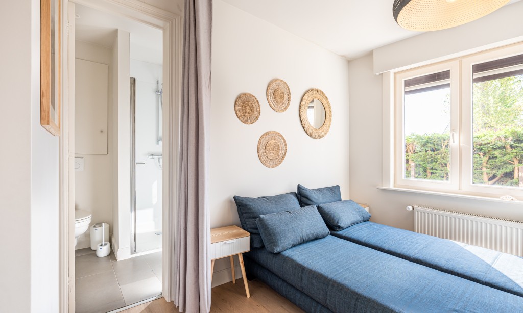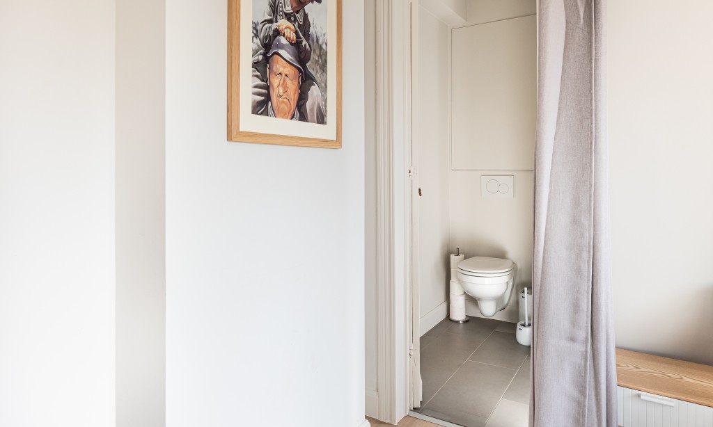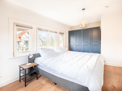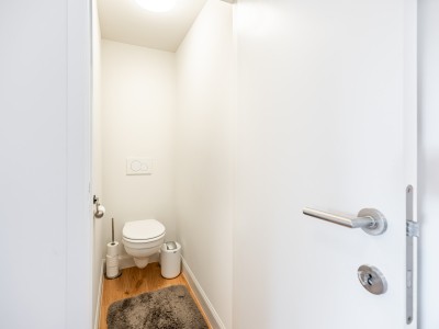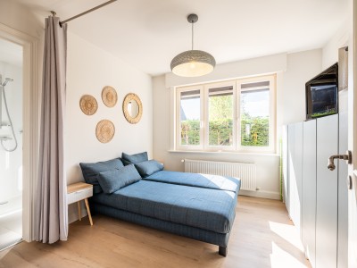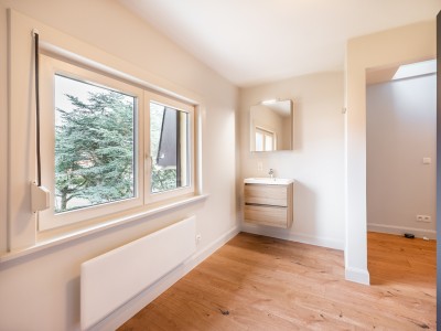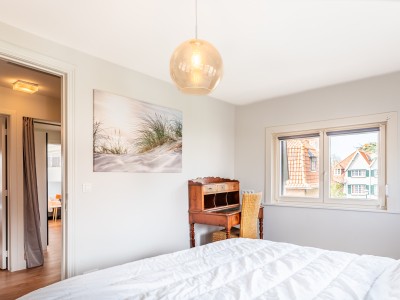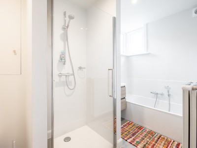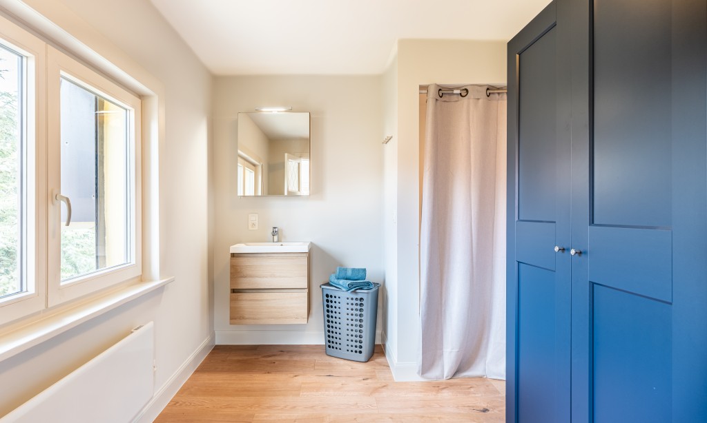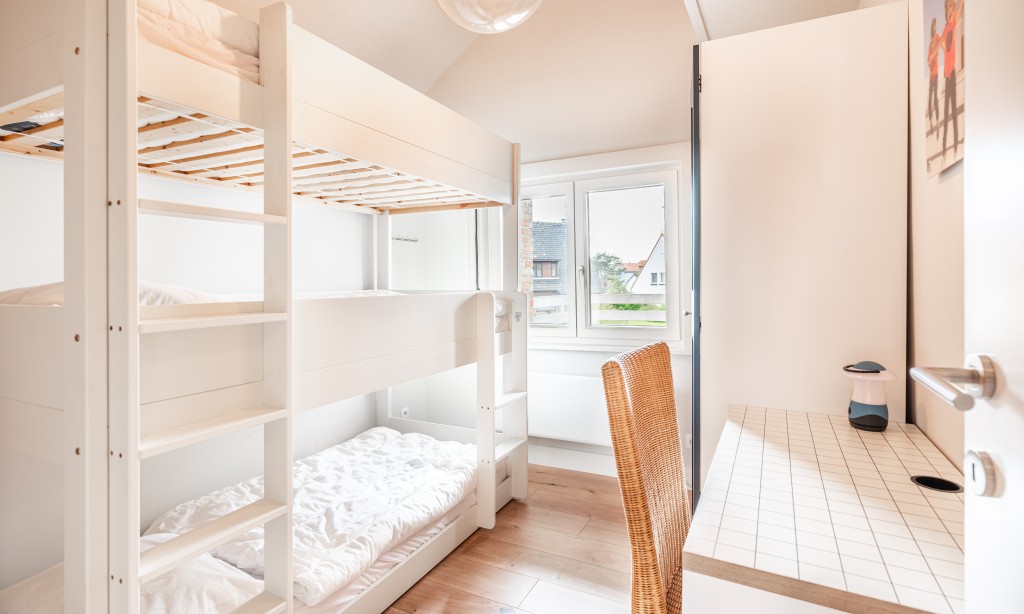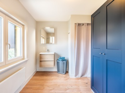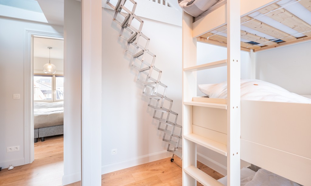1 großes Schlafzimmer mit großem Doppelbett, viel Schrankraum und einem Schreibtisch, 1 Schlafzimmer mit Doppelbett und Zugang zu einem kleinen Balkon, 1 Schlafzimmer mit Etagenbett für 3 Personen. In diesem Raum befinden sich auch ein Schreibtisch und die Dachbodentreppe. Im großen Nachtsaal gibt es eine Toilette und eine Ecke mit einem Waschbecken und einem Spiegel.