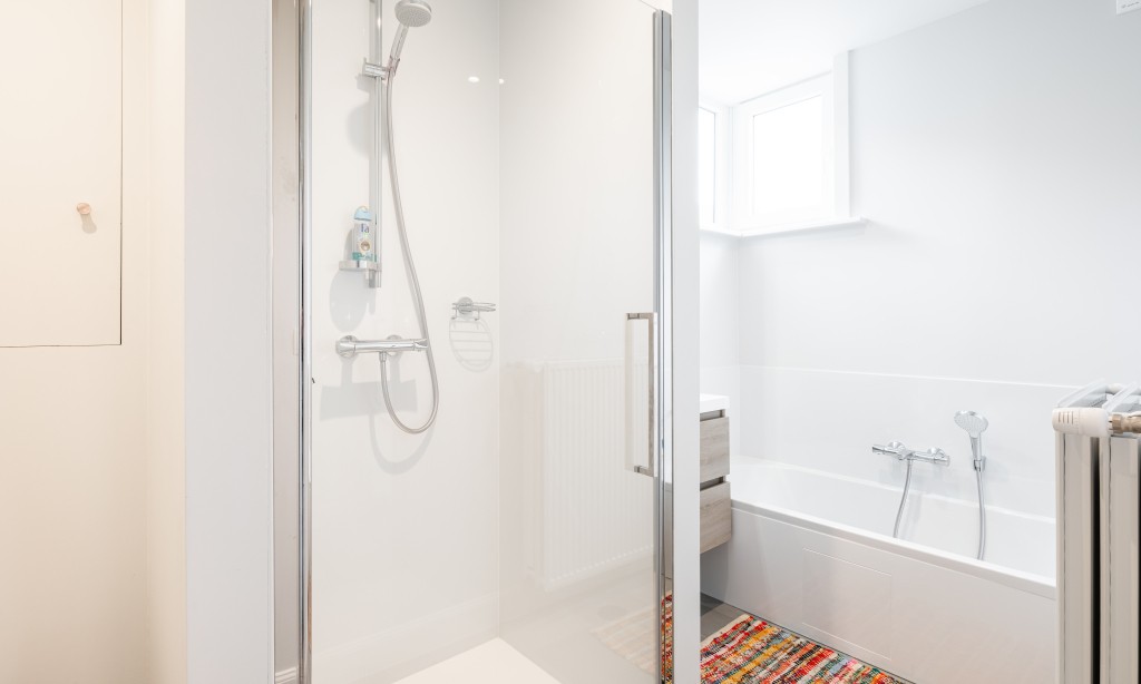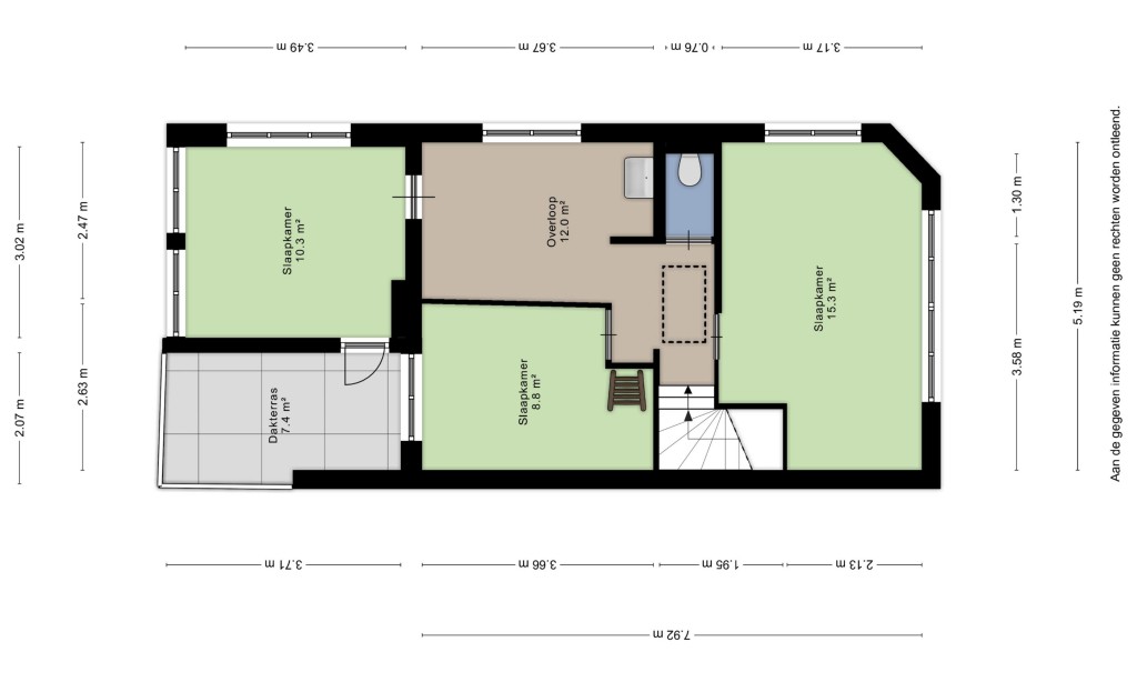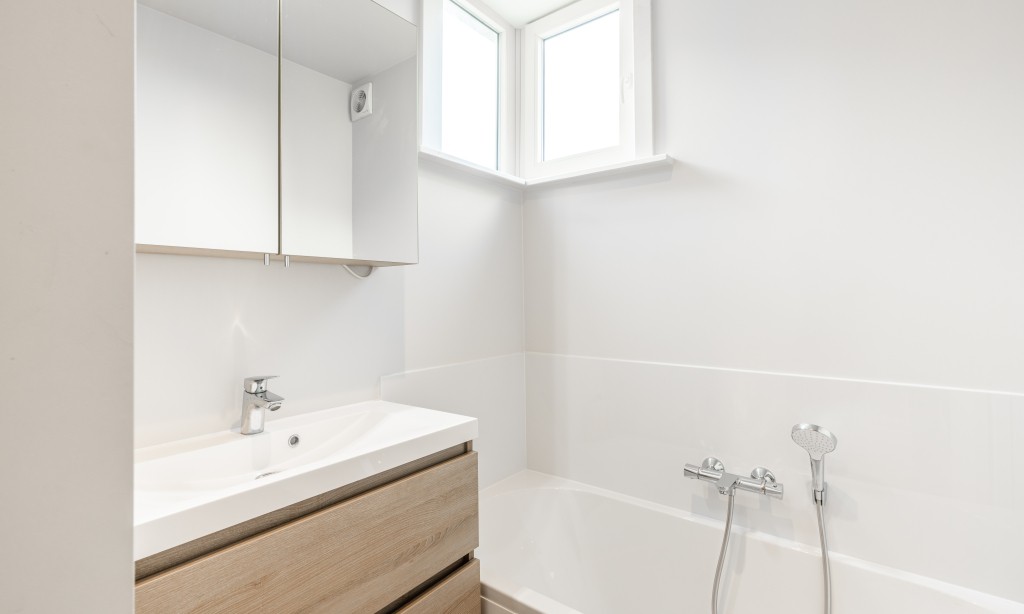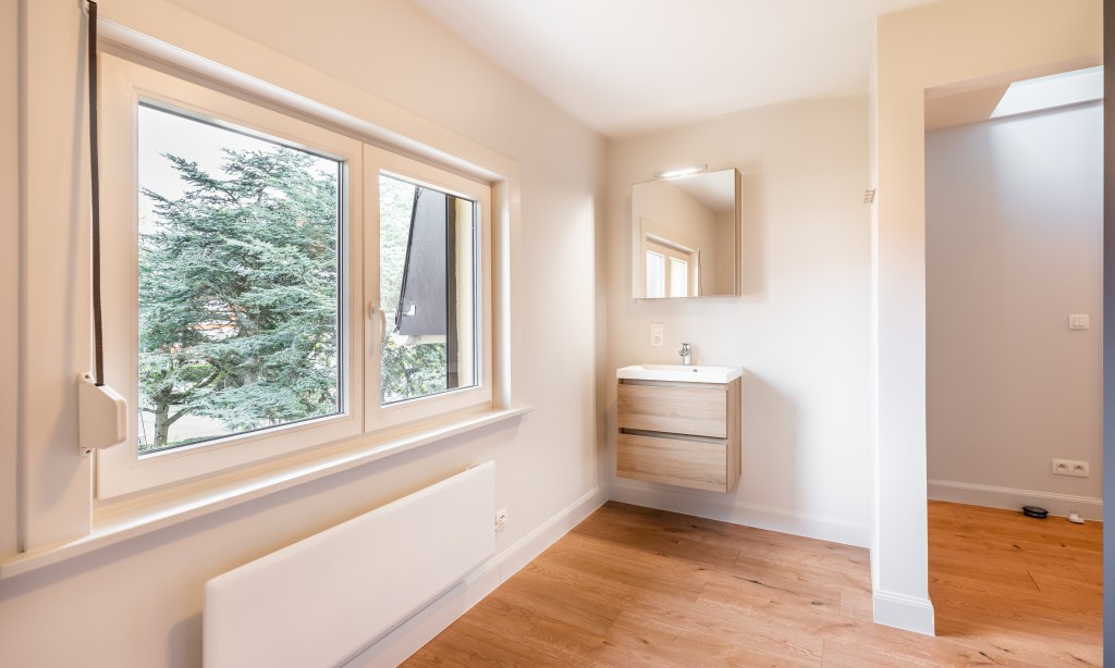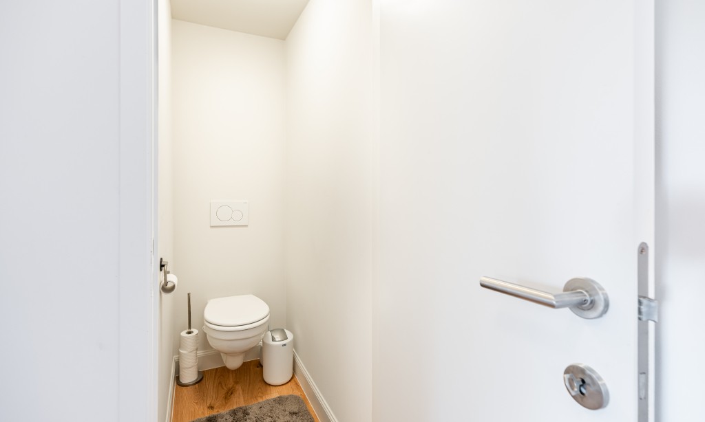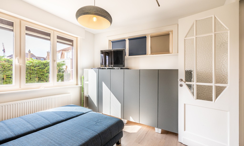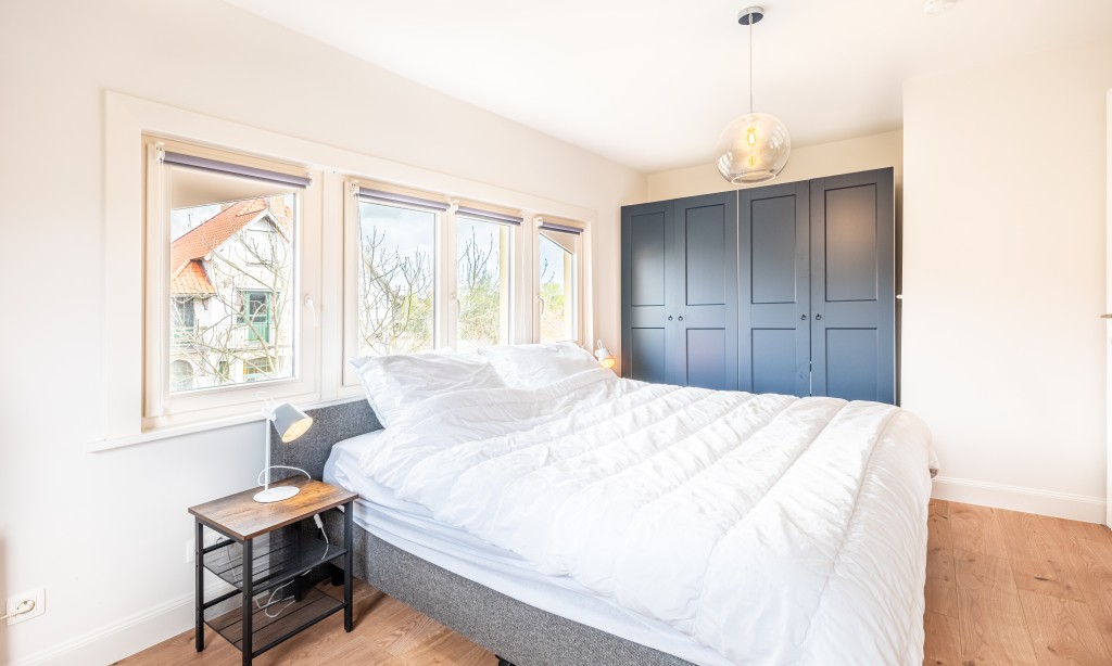 1 großes Schlafzimmer mit großem Doppelbett, viel Schrankraum und einem Schreibtisch, 1 Schlafzimmer mit Doppelbett und Zugang zu einem kleinen Balkon, 1 Schlafzimmer mit Etagenbett für 3 Personen. In diesem Raum befinden sich auch ein Schreibtisch und die Dachbodentreppe. Im großen Nachtsaal gibt es eine Toilette und eine Ecke mit einem Waschbecken und einem Spiegel.