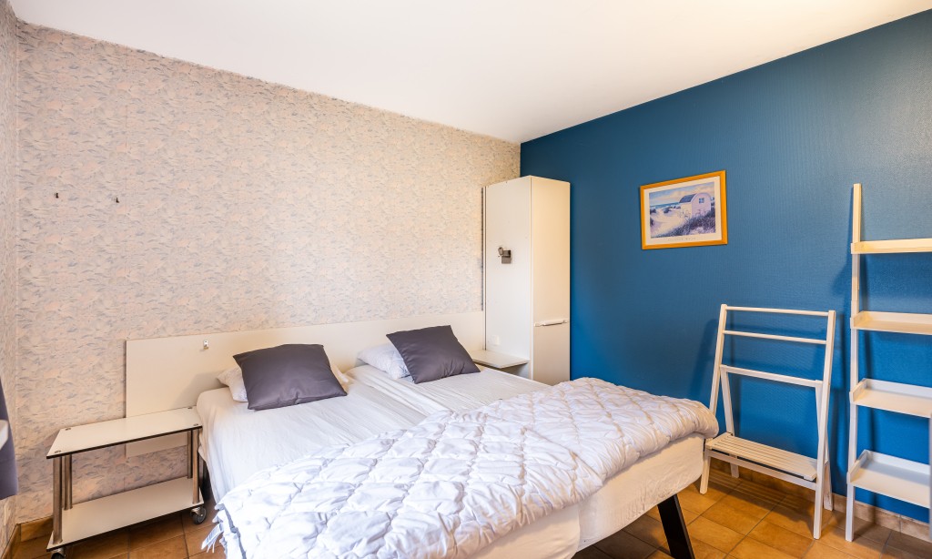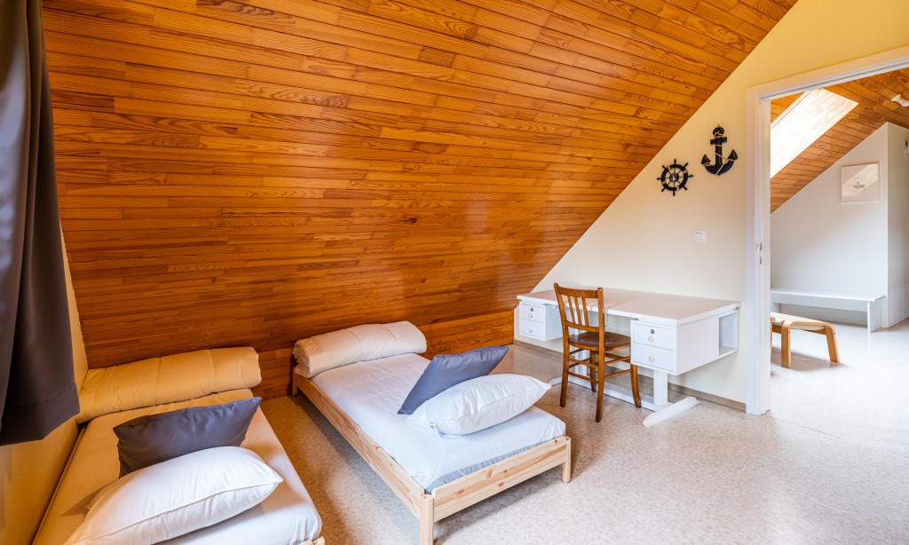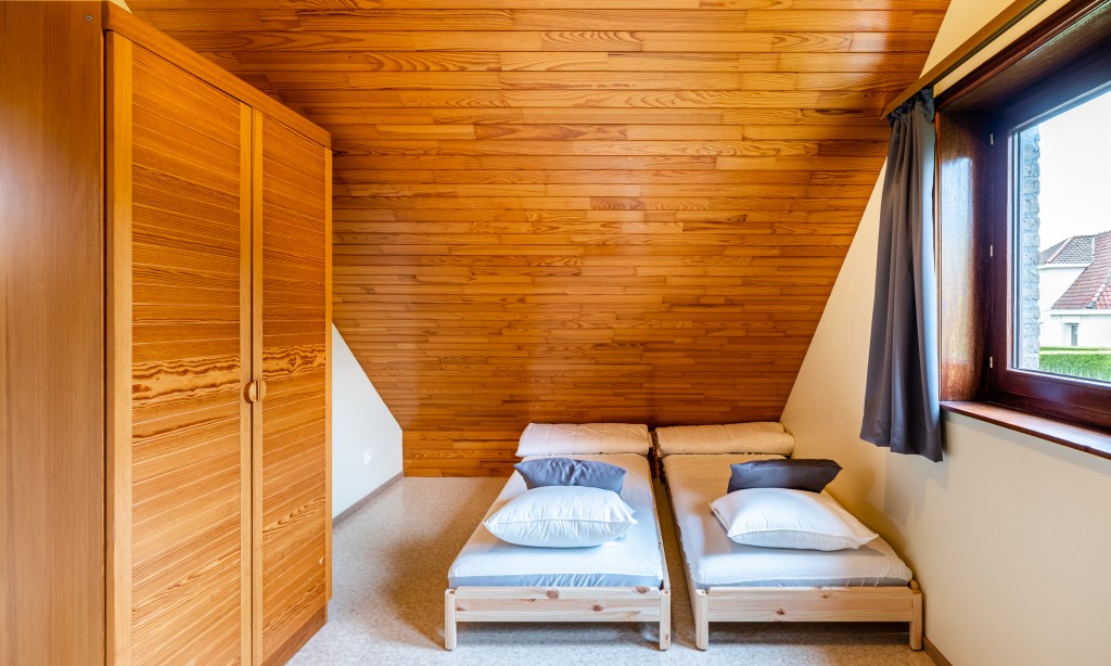 Großer Flur mit viel Stauraum (inkl. Kinderspielzeug), 1 Schlafzimmer mit Doppelbett und 1 Einzelbett, 1 Kinderzimmer mit 4 Einzelbetten und Schreibtisch. Sind Sie nur 6 oder 7 Personen? Die Einzelbetten im Kinderzimmer sind stapelbar. Wenn Sie 2 übereinander stellen, sind die Betten nicht mehr so niedrig.