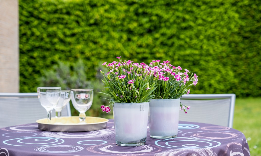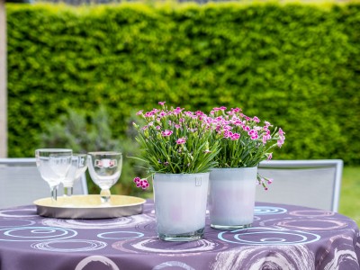 Große geflieste Terrasse mit zusätzlichem Picknicktisch. Auf der Rückseite befindet sich eine elektrische Markise. An den Fenstern zum Garten hin gibt es elektrische "Sonnenschirme". Diese halten das Wohnzimmer im Sommer kühler. Außerdem gibt es elektrische Rollläden an der hinteren Fassade und an der Seite.