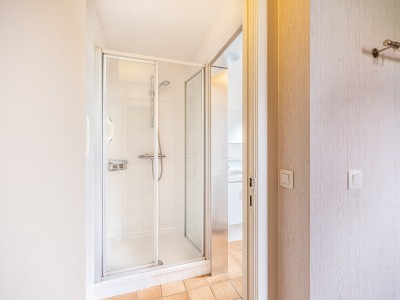 Eingangshalle, Badezimmer mit Dusche, Badewanne und Doppelwaschbecken, separate Toilette, separate Einbauküche, Wohn-/Esszimmer mit Zugang zur Terrasse und 2. Sitzecke mit TV, 1 Schlafzimmer mit Doppelbett (lits jumeaux), Schreibtisch unter der Treppe, Abstellraum am Seiteneingang mit Gartenmöbeln