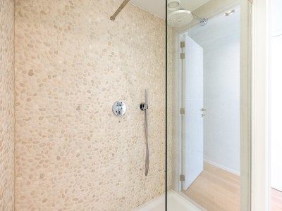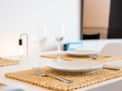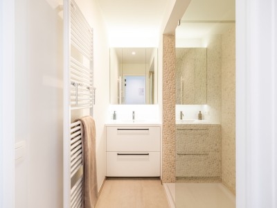 Wohnzimmer mit integrierter, moderner Einbauküche mit allen Annehmlichkeiten, Badezimmer mit begehbarer Dusche, separates WC, ein Schlafzimmer mit Doppelbett, ein Schlafzimmer mit Einzelbett. Balkon auf der Meerseite und Balkon auf den Schlafzimmern.