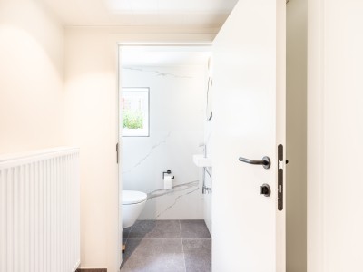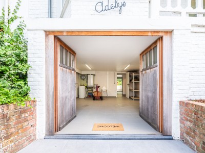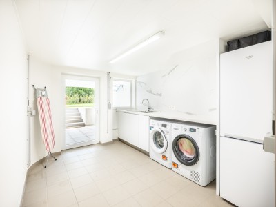 Erdgeschoss: Auf Straßen- und Gartenniveau befindet sich die Garage, in der Sie Fahrräder, Kinderwagen und Fahrradanhänger abstellen können. Vor der Garage können Sie ein Auto parken. Hinter der Garage befinden sich eine Waschküche, ein Hauswirtschaftsraum und ein komplett ausgestattetes Badezimmer mit separatem WC.