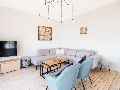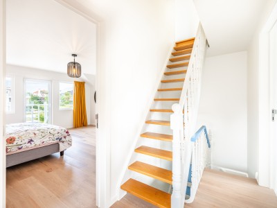 1. Etage: Im ersten Stock befinden sich das Badezimmer mit Badewanne, Dusche, Waschbecken und WC sowie zwei große Schlafzimmer mit Doppelbett (Boxspring), ein Babybett und ausreichend Schrankraum. Über die Treppe gelangen Sie in das nächste Stockwerk.