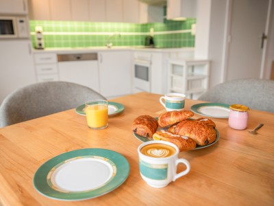 Die Eingangshalle führt in das sonnige Wohnzimmer mit Fernsehecke, Essbereich und offener, ausgestatteter Küche mit Zugang zum Balkon. Es gibt ein Schlafzimmer mit einem Doppelbett und ein Schlafzimmer mit einem Etagenbett für 3 Personen (Doppelbett unten und Einzelbett oben). Das Badezimmer besteht aus 2 Waschbecken in einer Badezimmereinheit und einer Badewanne mit Duschwand. Es gibt eine separate Toilette. Die Wohnung ist außerdem mit einer Lesebank am Fenster ausgestattet und für die Kleinen stehen ein Kinderbett und ein Hochstuhl bereit.
