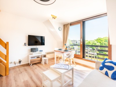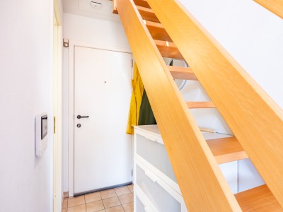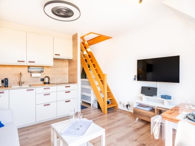 Es besteht aus einem Flur, einem Badezimmer mit Dusche und Toilette, einem Wohnzimmer mit Zugang zum Balkon, einer offenen Küche, einem Schlafzimmer im Obergeschoss.