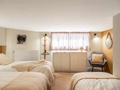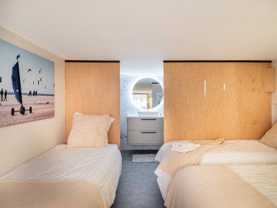 Geräumiges Schlafzimmer mit 4 Einzelbetten, Badezimmer mit Badewanne und Waschbecken