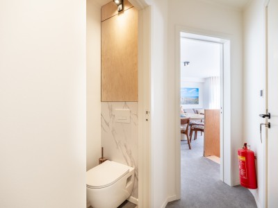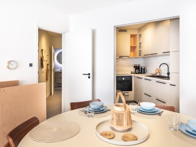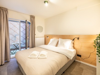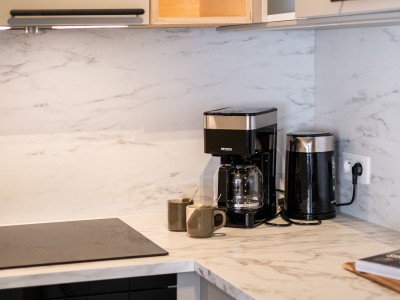 Separater Eingang. Wohnzimmer mit viel Licht; gemütliche Sitzecke und angenehmer runder Tisch, Küchenecke mit Induktionskochfeld, Kombi-Mikrowelle, geräumiger Kühlschrank mit separatem Gefrierfach für Eis/Suppe/Pizza...., separates WC, Schlafzimmer mit Doppelbett und Zugang zum Innenhof, Badezimmer mit begehbarer Dusche und Waschbecken.