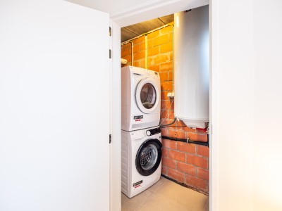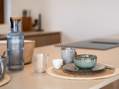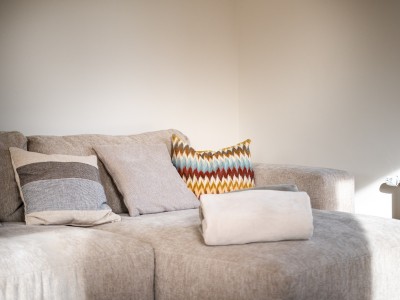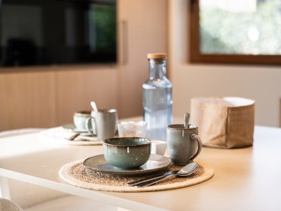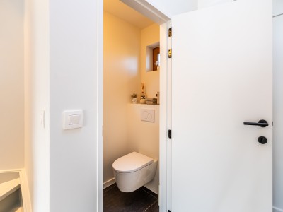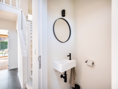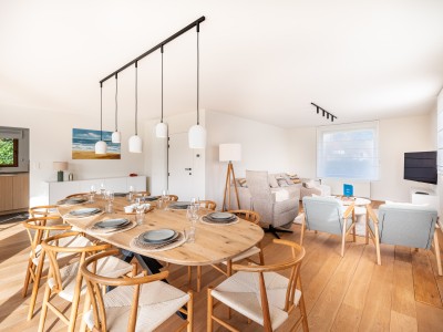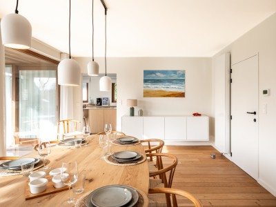 Flur mit separater Toilette, sonniges Wohnzimmer mit Ecksofa, Essbereich mit großem Tisch und Zugang zur schönen Terrasse und Blick auf den Garten, separat eingerichtete Küche mit Zugang zur Terrasse. Wichtig zu wissen ist, dass sich im Erdgeschoss ein Schlafzimmer für 2 Personen mit eigenem Bad befindet. Ideal für Menschen mit eingeschränkter Mobilität. Im dieses Schlafzimmer befindet sich auch die Waschküche mit Waschmaschine und Trockner.