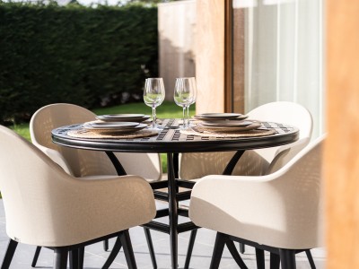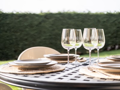 Geräumige Terrasse auf der Rückseite des Hauses, zugänglich über das Wohnzimmer und die Küche. Die Terrasse ist teilweise überdacht und verfügt über einen Terrassenheizstrahler, sodass Sie auch an kühleren Abenden draußen sitzen können. Die Terrasse ist mit einem großen Tisch und 10 Stühlen sowie einem Sonnenschirm ausgestattet. Der umzäunte Garten verfügt außerdem über einen Bouleplatz, ein Gartenhaus/eine Bar und einen Gasgrill, um Ihren Aufenthalt perfekt zu machen. Terrasheizung unter den abgedeckte Terasse.