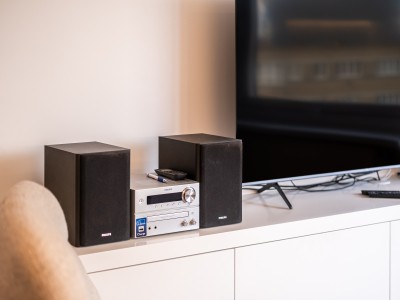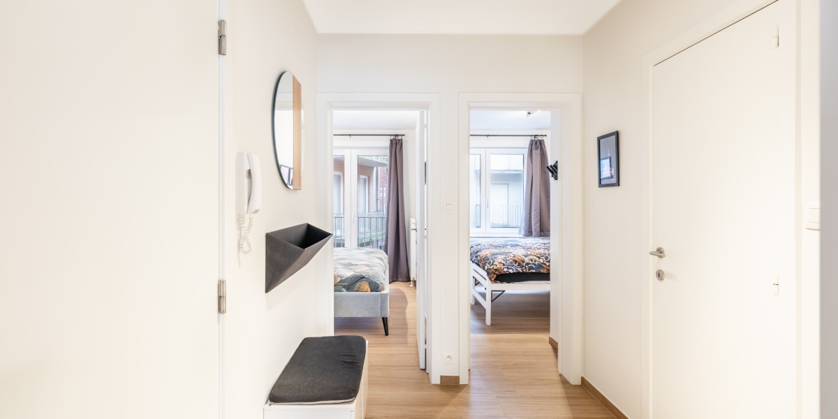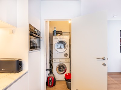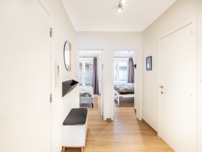 Eingangsflur, helles Wohnzimmer mit offener, voll ausgestatteter Küche, Meerblick, kleiner Balkon mit Tisch und Stühlen, Abstellraum mit Waschmaschine und Trockner, Badezimmer mit ebenerdiger Dusche und Waschbecken, separates WC, Schlafzimmer 1 mit Doppelbett (180 × 200 cm), Stauraum, Kleiderschrank und Zugang zum hinteren Balkon, Schlafzimmer 2 mit zwei Einzelbetten (90 × 200 cm), Stauraum und Kleiderschrank.