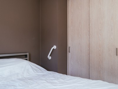 Die Wohnung ist für Menschen mit eingeschränkter Mobilität eingerichtet, unter anderem mit einer erhöhten Wandtoilette mit Griffen, einer begehbaren Dusche mit rutschfestem Boden anstelle einer Badewanne und einem Schlafzimmer mit einem erhöhten Bett in Sitzhöhe mit einem Handgriff.