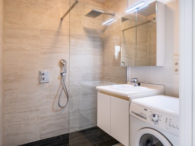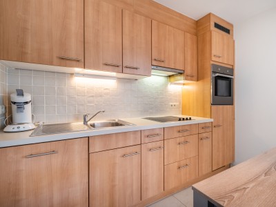 Das Appartment hat ein Eintritshall, Badezimmer mit Dusche, Wascmachine, separates Toilet, Schlafzimmer mit Doppelbed, Wohnzimmer mit offene ausgestatette Küche, Abstelraum, Schalfzimmer mit 2 Einzelbetten, sonniges Holzterasse mit Môbel.