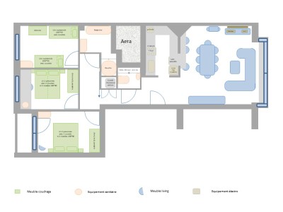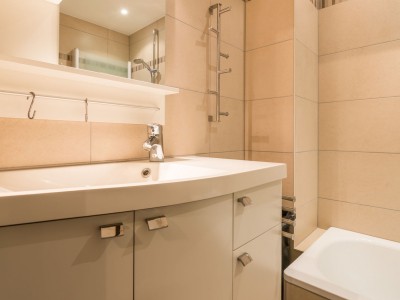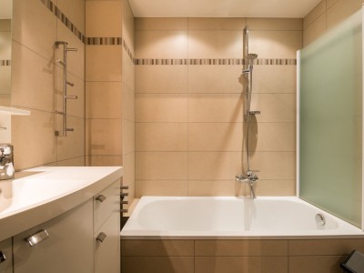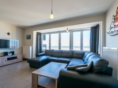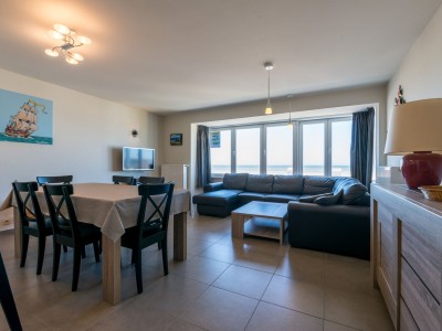 Halle, ein geräumiges Wohnzimmer mit Meerblick, separate Einbauküche, WC, Bad mit Dusche und Badewanne, Schlafzimmer für 4 Personen mit 2 Etagenbetten (2 x 1 Pers.), 2 Schlafzimmer mit einem Doppelbett.
