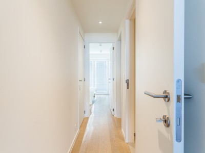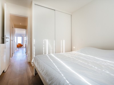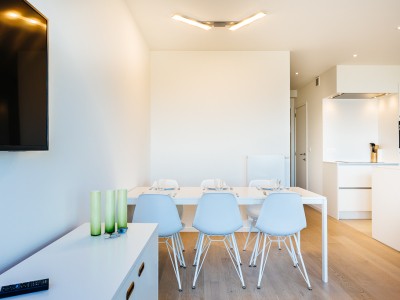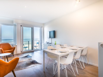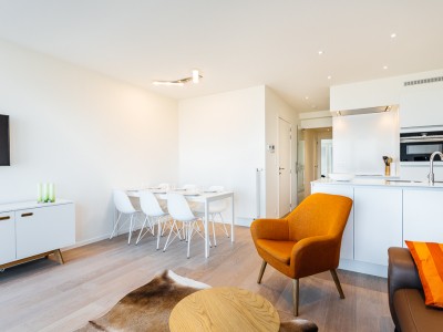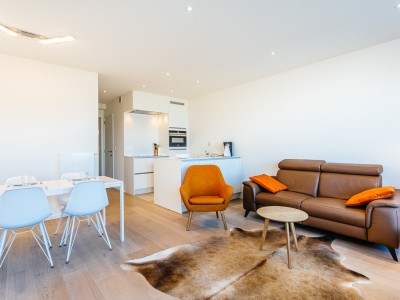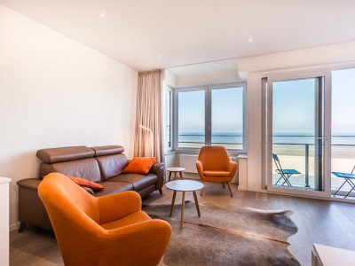 Modernes Luxusapartment an der Strandpromenade, nahe den Dünen, im 4. Stock mit Aufzug. Geräumiges Wohnzimmer mit direktem Meerblick. Voll ausgestattet, moderner Stil. Keine Haustiere erlaubt.