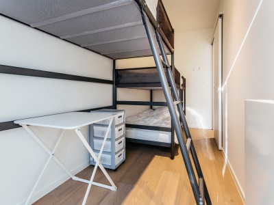 Wohnzimmer mit integrierter moderner Einbauküche mit allen Annehmlichkeiten, Bad mit begehbarer Dusche, separates WC, ein Schlafzimmer mit Doppelbett, ein Schlafzimmer mit Etagenbett und Etagenbett und Platz für Kinderbett, zusätzliche Schlafmatte oder Arbeitszimmer. Balkon auf der Meerseite und Balkon in den Schlafzimmern.